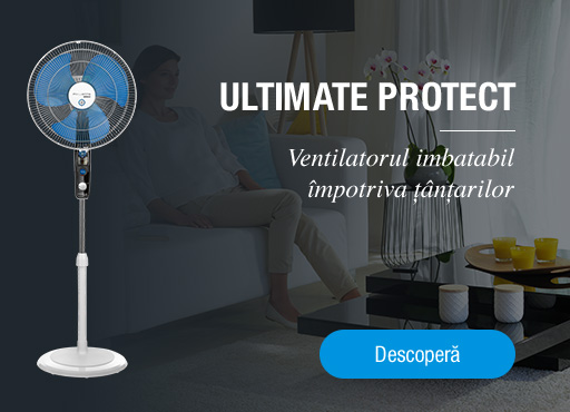 Ultimate Protect este un ventilator imbatabil împotriva țânțarilor. Lichidul exclusiv asigură protecție excelentă împotriva țânțarilor, în timp ce ventilarea îi sporește eficienţa. Bucură-te de senzația răcoritoare fără a lăsa țânțarii să îți creeze neplăceri!