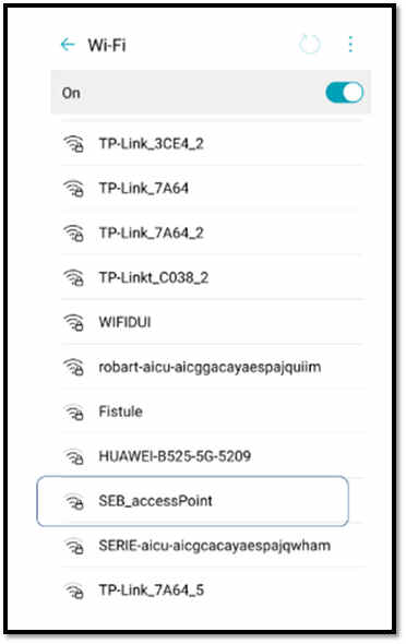 • Dacă telefonul se conectează automat, elimină această rețea din lista preînregistrată de rețele Wi-Fi. După această operațiune, asigură-te că rețeaua „SEB_accesPoint” este încă prezentă în lista de rețele Wi-Fi a telefonului.