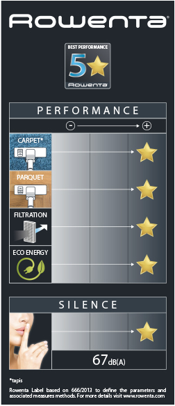 Eticheta Rowenta bazată pe reglemenările UE n°666/2013 ce definesc parametrii și metodele de măsurare.